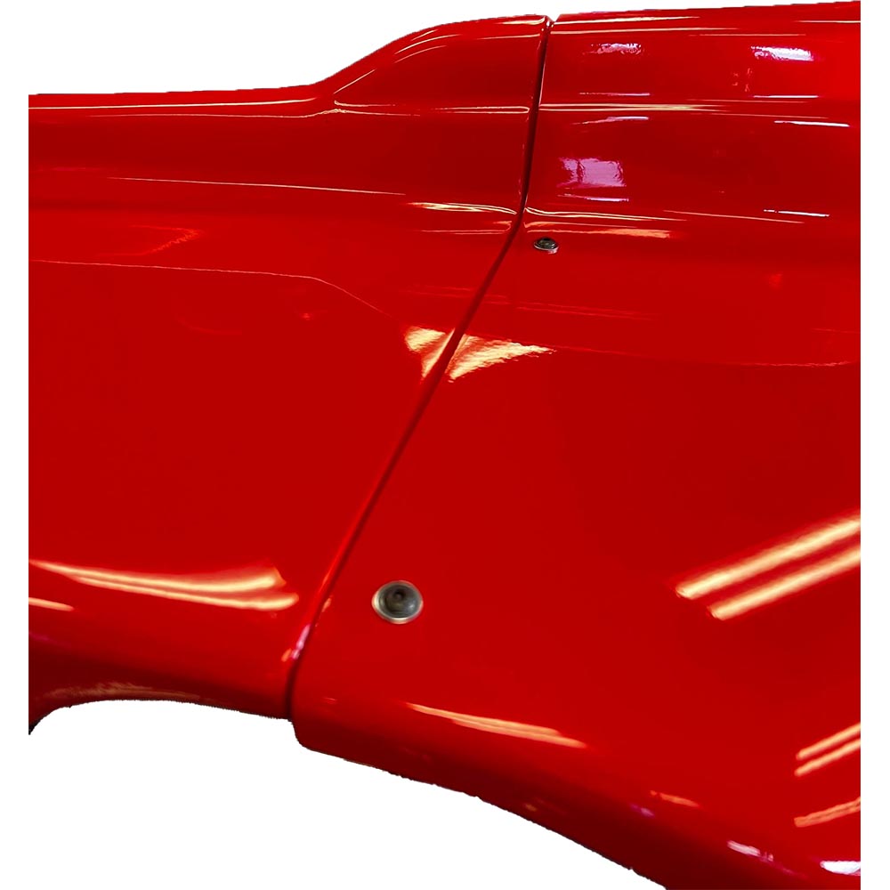 The SS 2.0 features precision cut & matching overlays with a 2" lip which connects the nose and side panels. The side panel wheel-wells have been reshaped and redesigned with a rolled edge so that the appearance and contour is exactly the same every time it is popped out of the mold and finished. The fitment on the kart is identical to the original SS in terms of width and length. However, the fiberglass molds were made from scratch and finished to a high gloss.