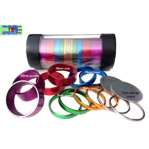 2 x 20mm, 2 x 15mm, 2 x 10mm, 2 x 7mm, 2 x 5mm, 2 x 3mm plus 1mm thick end caps that keep others from knowing your set up.