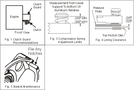 There are limits on the amount of spring adjusting that can be done before damage to the clutch occurs. (Figure 3) Do not adjust the springs below .250" or they will coil bind (bottom out) before the clutch can hook up solid. This will cause the clutch to build heat from over slipping and eventually burn up. If the limit of .250" has been reached and you still want a higher stall speed, you need to install optional stiffer springs or remove weight from levers. Be careful not to exceed the maximum adjustment limit of .300" as the adjustment screws could work loose. (Figure 3)