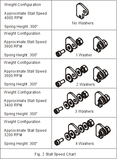 The stall speed recommendations (Figure 2) are for reference only. Finite adjustments must be made to adapt to track conditions, air density, engine setup, etc. From the factory, the clutch is designed for a smooth and positive lockup. However if you prefer a harder lockup, install all weight on levers and replace the black springs with optional red springs.